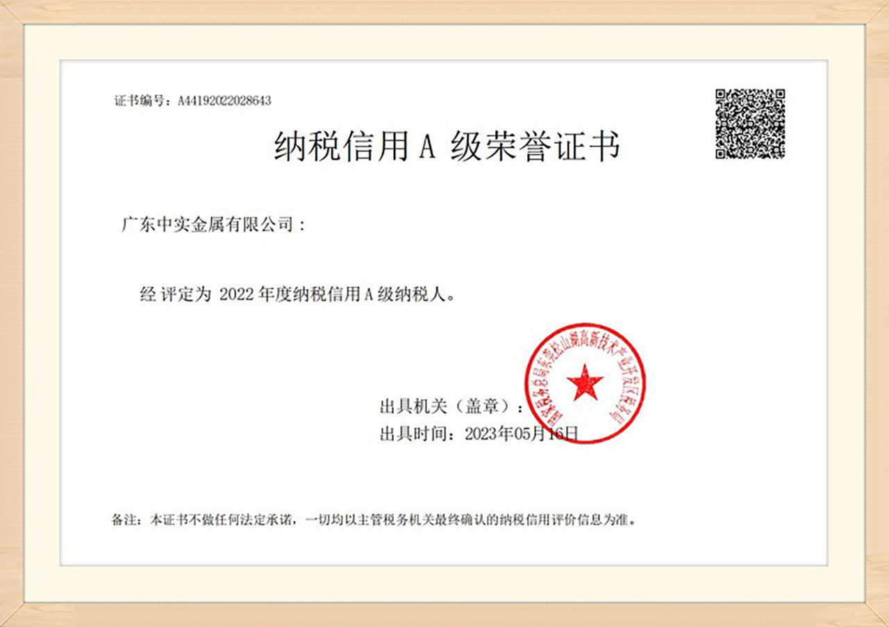 近日,國家稅務總局廣東省稅務局公布了2022年度納稅信用評定結(jié)果,廣東中實金屬有限公司榮獲“?2022?年度納稅信用?A?級納稅人”。