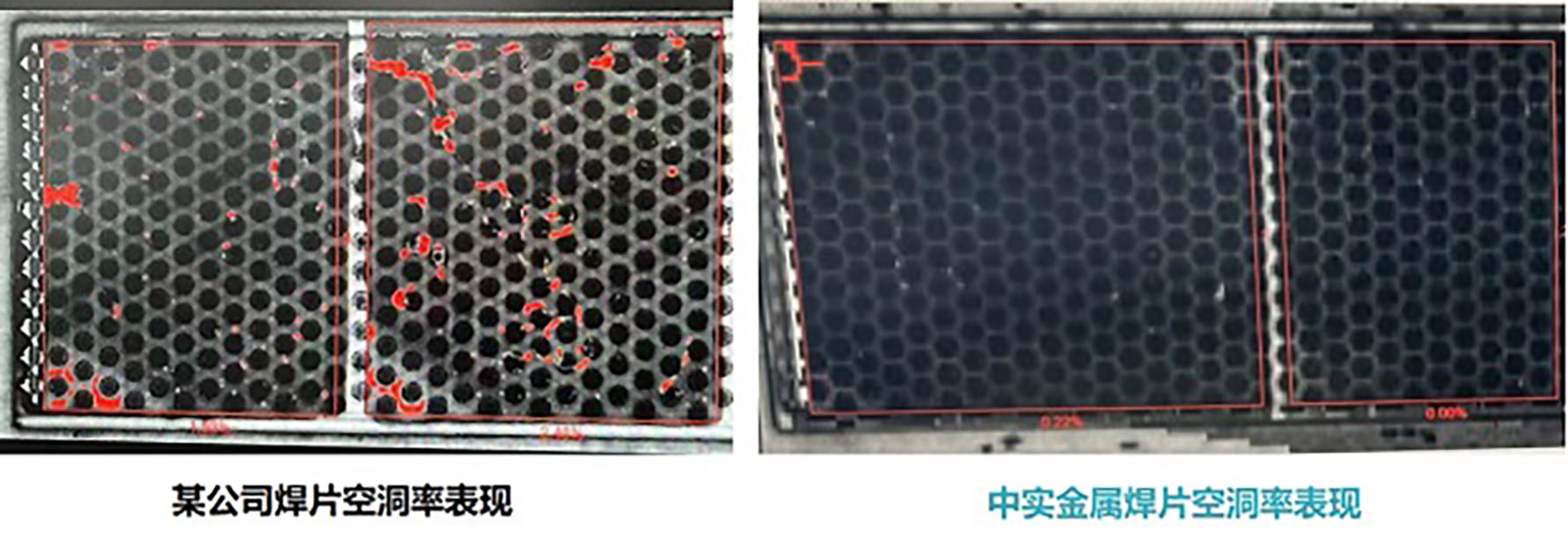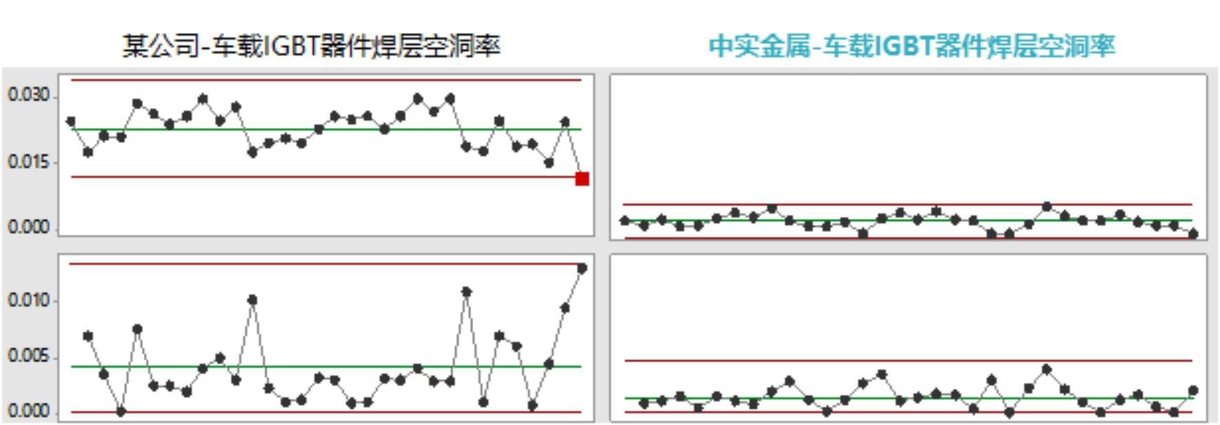 以下為對比實(shí)驗(yàn)數(shù)據(jù),可以看到中實(shí)IGBT預(yù)成型焊片,有效降低了焊接空洞率,且產(chǎn)品穩(wěn)定性表現(xiàn)更佳。