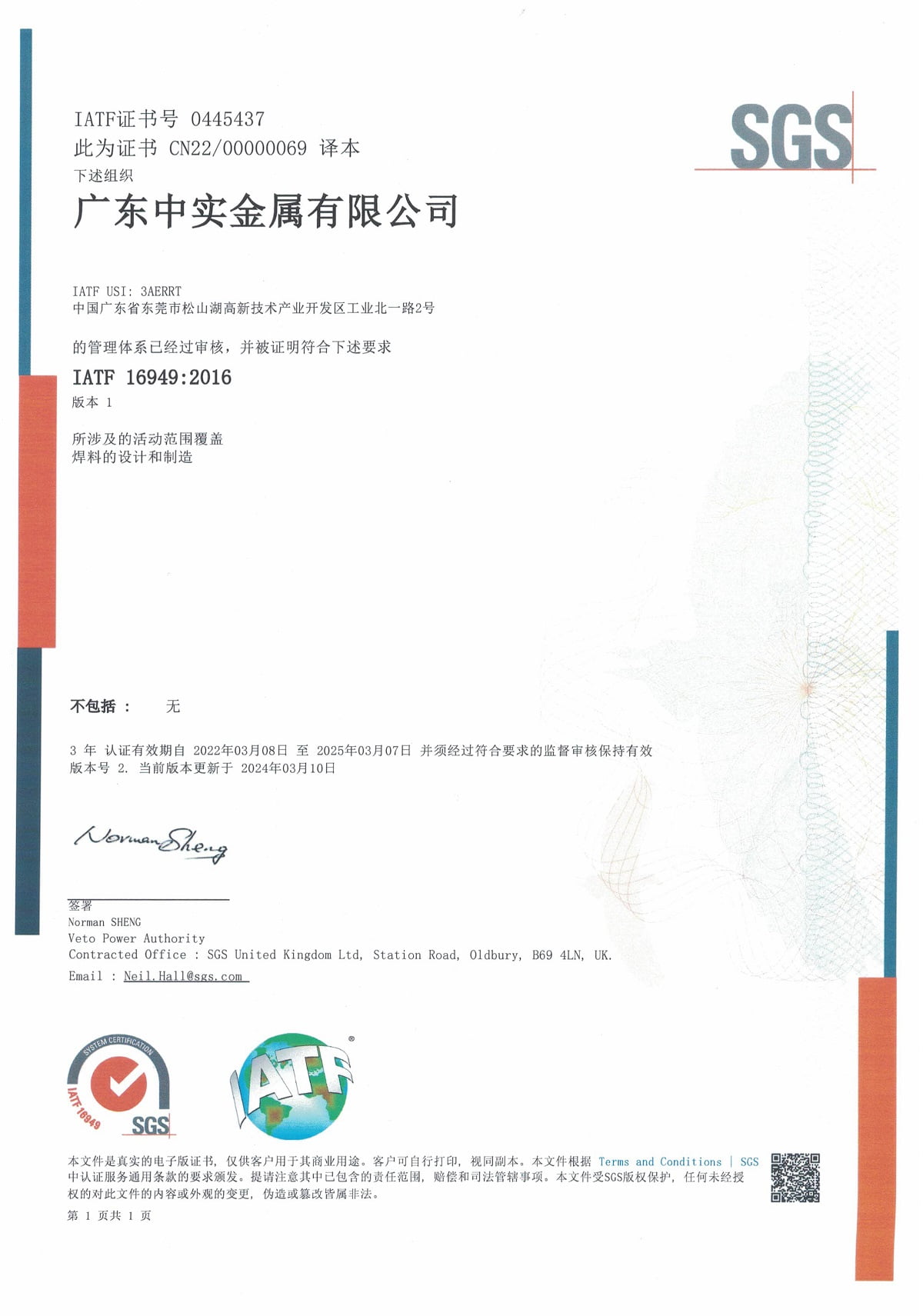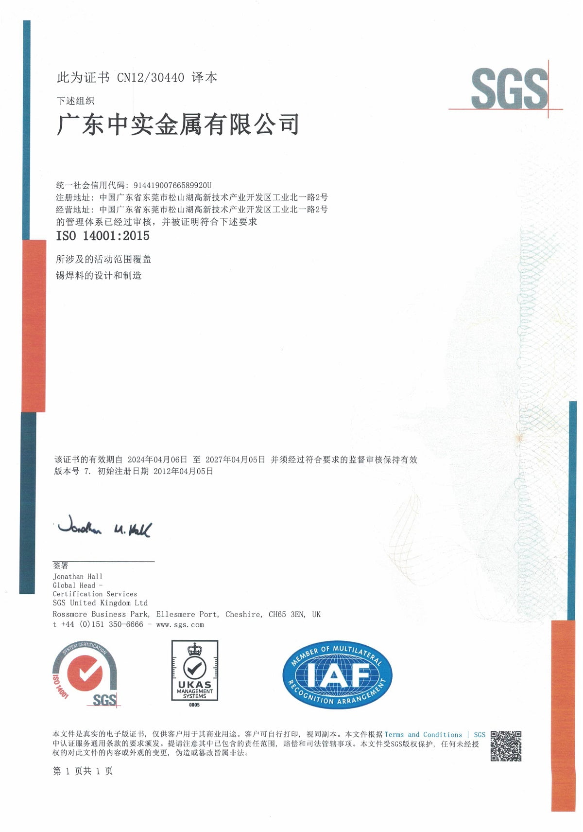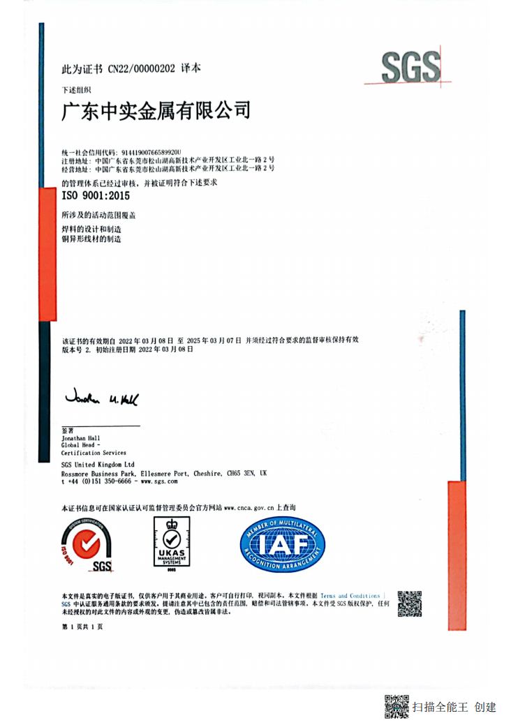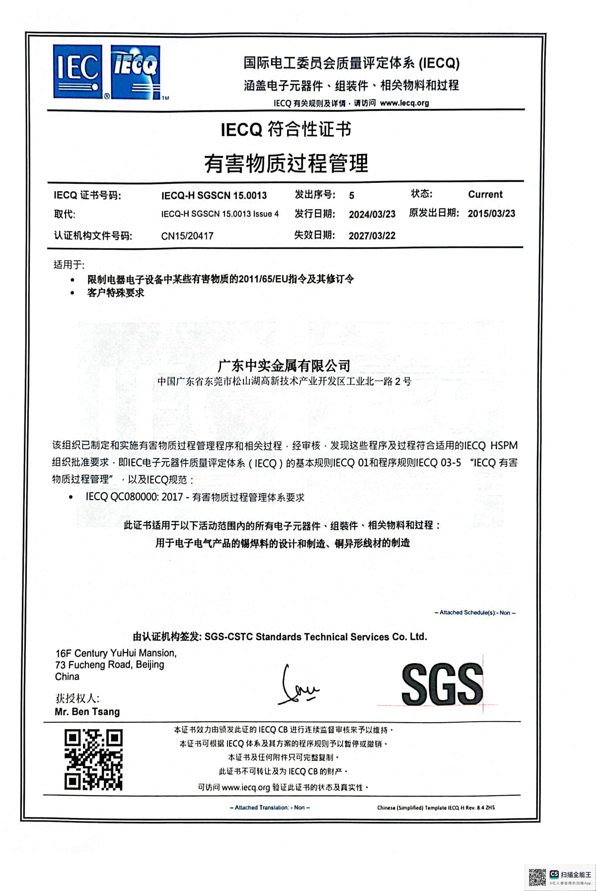 證書號:IECQ-H SGSCN 15.0013